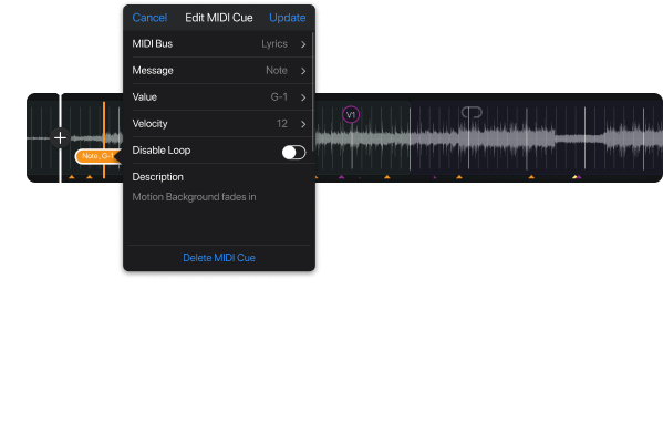 Kontrol lirik, lampu, dan lainnya dengan Isyarat MIDI yang ditambahkan ke lagu yang dibeli atau lagu Cloud.