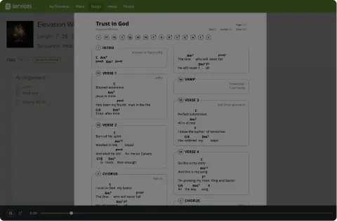 Rehearse Bundle mencakup sumber daya dan alat untuk melengkapi tim kamu agar siap tampil. Aplikasi ChartBuilder disertakan dalam paket, dan merupakan alat yang luar biasa untuk musisi dan vokalis, sehingga mereka dapat tampil dengan percaya diri dalam persiapan mereka. Selain itu, bundel ini juga mencakup akses integrasi Planning Center dan bahkan unduhan grafik PDF yang dapat menjadi cara alternatif yang bagus untuk memberikan akor dan lirik yang dibutuhkan tim kamu, sehingga kamu semua memiliki pemahaman yang sama.